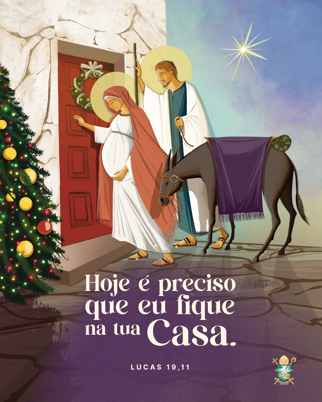 Para sinalizar esta CE 2025, o artista sacro, Antônio Batista, desenvolveu um cartaz, no qual a ideia central é a da acolhida de Jesus nascente na casa das famílias que estão dispostas a abri-la ao Senhor que quer habitar conosco. No livro do Apocalipse, Jesus diz: “Eis que estou à porta e bato. Se alguém ouvir a minha voz e abrir a porta, eu entrarei em sua casa e tomarei refeição com ele, e ele comigo” (Ap 3,20). “Em comunhão com toda Igreja que se preparar para celebrar o Natal do Senhor, retratamos no cartaz a família de Nazaré: Maria e José que batem à nossa porta e nos trazem o seu filho Jesus, que quer nascer entre nós. Há uma mistura do tempo de Jesus com o nosso tempo, a fim de confrontar o natal comercial com o Natal de Jesus. Há muito, as praças e os lares católicos são tomados pela cultura do brilho, das luzinhas e do Papai Noel, fazendo com que todos entrem no clima natalino-comercial, de trocas de presentes, de confraternizações sem fim. Este natal do consumo, acom- panhado de muito brilho e propaganda, tem sempre sucesso e capacidade de fechar as casas, impedindo-nos de entender, acolher, de celebrar como irmãos a verdadeira beleza do Natal de Jesus”, afirmou o artista. O tema preside ao cartaz, provocando-nos à reflexão: “Hoje, é preciso que eu fique na tua casa” (Lc 19,5). Contemplando este cartaz, reflitamos e deixemos, neste advento, nossas casas de portas abertas para o Cristo que deseja nascer, ser acolhido e morar entre nós, ajudando-nos com seu exemplo a vivermos de portas abertas também aos irmãos e irmãs.