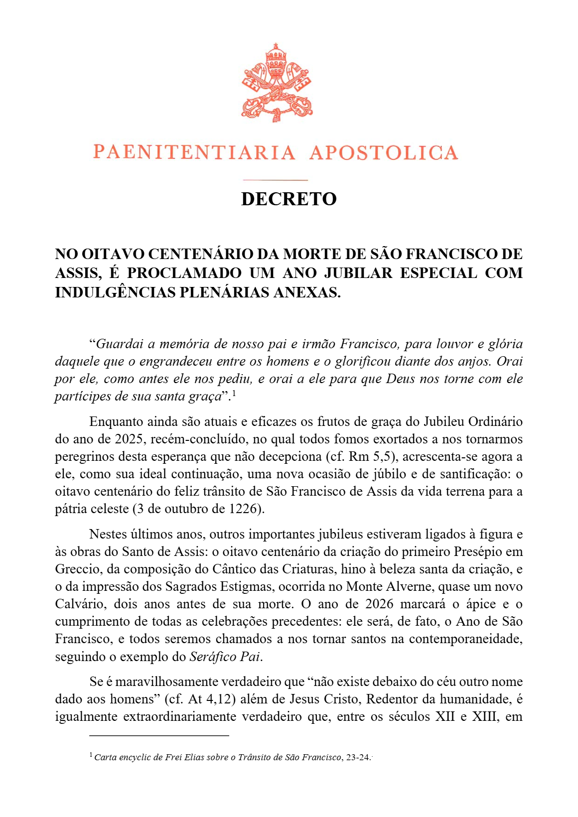 O Vaticano anunciou um evento de grande significado espiritual para a Igreja Católica, a proclamação de um ‘Ano Jubilar Especial’ em honra ao ‘Oitavo Centenário da Morte de São Francisco de Assis’. O decreto, emitido pela Penitenciaria Apostólica, estabeleceu o período de 10 de janeiro de 2026 a 10 de janeiro de 2027 para a celebração, visando inspirar os fiéis a seguirem o exemplo do Seráfico Pai em santidade, paz e caridade.